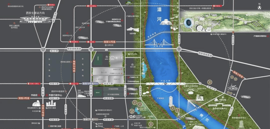 三环、绕城、北⾠⽴交等城市⼲道环伺 ,构成“三季有花,⻄安地铁10号线号线(规划中),